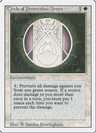 1: Prevents all damage against you from one green source. If a source does damage to you more than once in a turn, you must pay 1 mana each time you want to prevent the damage.