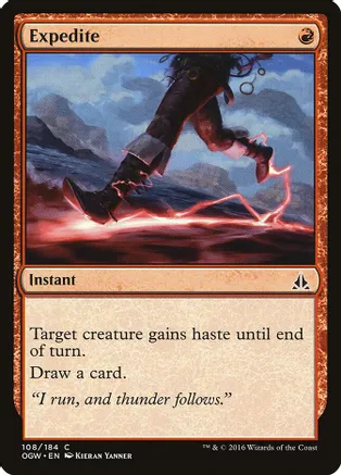 Target creature gains haste until end of turn. Draw a card. Rarity: C #: 108 Card Type: Instant Flavor: “I run, and thunder follows.” Artist: Kieran Yanner