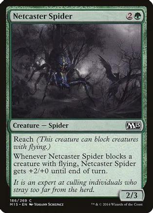 Whenever Netcaster Spider blocks a creature with flying, Netcaster Spider gets +2/+0 until end of turn.