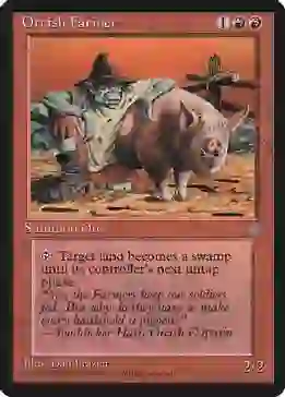 T: Target land becomes a swamp until its controller’s next untap phase. Rarity: C #: 207 Card Type: Creature Orc P / T: 2 / 2 Flavor: “Yes, the Farmers keep our soldiers fed. But why do they have to make every battlefield a pigpen?”—Toothlicker Harj, Orcish Captain Artist: Dan Frazier