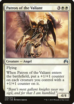 When Patron of the Valiant enters the battlefield, put a +1/+1 counter on each creature you control with a +1/+1 counter on it.