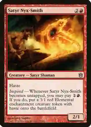 Inspired – Whenever Satyr Nyx-Smith becomes untapped, you may pay 2R. If you do, put a 3/1 red elemental enchantment creature token with haste onto the battlefield.