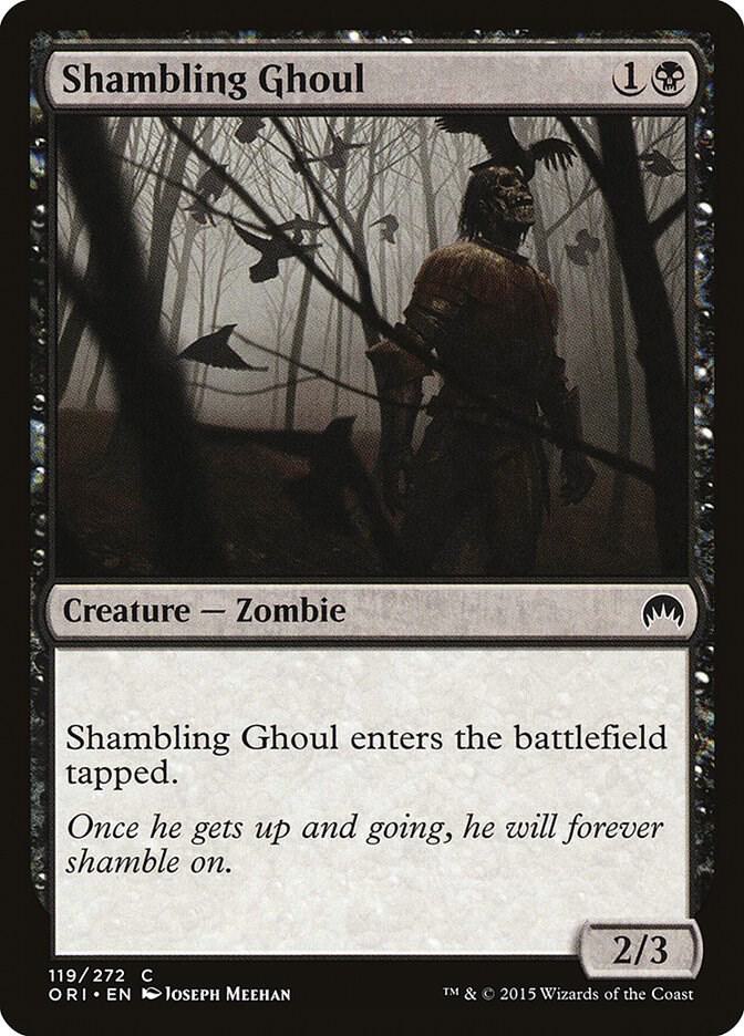 Shambling Ghoul enters the battlefield tapped. Rarity:C #:119 Card Type:Creature — Zombie P / T:2 / 3 Flavor:Once he gets up and going, he will forever shamble on. Artist:Joseph Meehan
