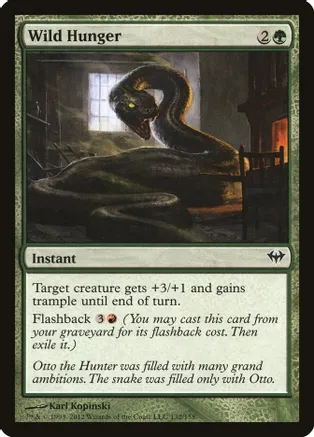 Target creature gets +3/+1 and gains trample until end of turn. Flashback 3R (You may cast this card from your graveyard for its flashback cost. Then exile it.) Rarity: C #: 132 Card Type: Instant Flavor: Otto the Hunter was filled with many grand ambitions. The snake was filled only with Otto. Artist: Karl Kopinski